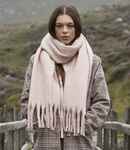 100% recycled polyester. Luxury soft touch fabric. Oversized styling. Chunky, wrap around design. Tassel trim. Removable adhesive fabric label.
